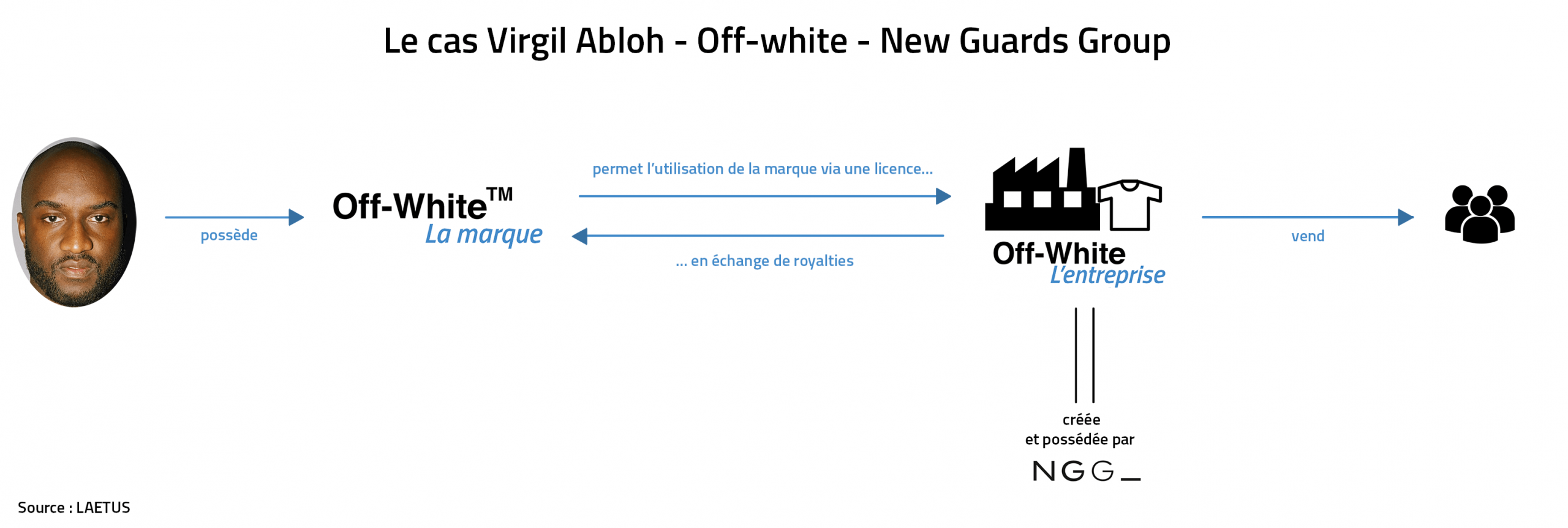 De plus, Off-white donnera les droits d’exploitation de la marque en échange de royalties, permettant à Virgil Abloh d’être rémunéré sur l’exploitaiton de l’image de la marque. L’intégralité des risques liés au développement de l’entreprise Off-white, sur sa structuration, son organisation et sa création de valeur est prise par NGG, propriétaire de l’entreprise, et faiblement par Virgil Abloh.